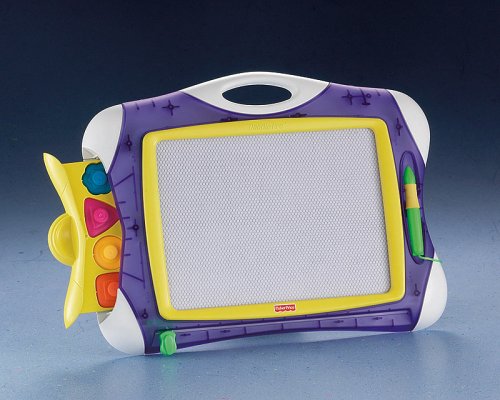 - Includes extra-large magnetic drawing screen, 4 magnetic shape stampers, comfort-grip screen saver pen and built-in carry handle for portability.